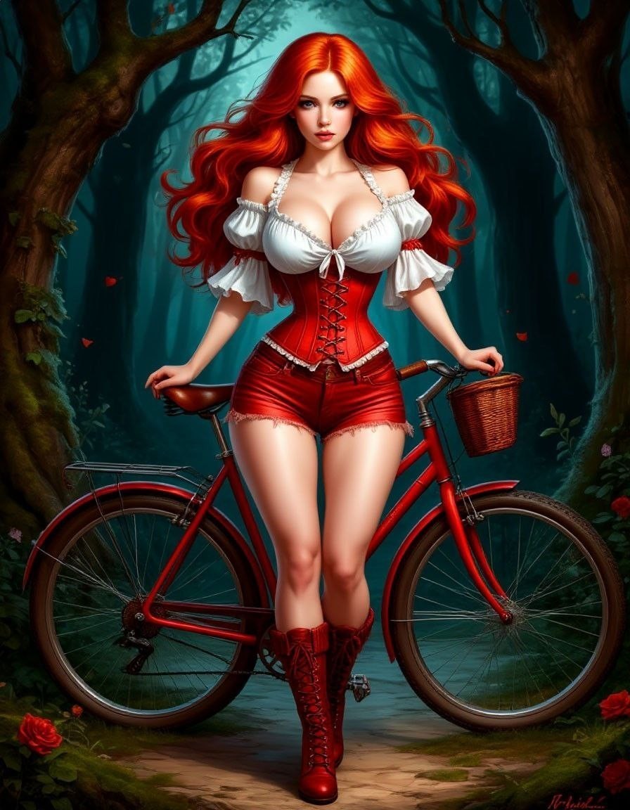 По деревянным стенам бегали солнечные зайчики, когда Красная Шапочка поворачивала зеркало то вперед, то назад, пытаясь себя разглядеть. Вьющееся копна огненно–рыжих волос, налитые розовым цветом губы, тонкие брови и большие глаза цвета лазурного неба. На ней была белая тонкая блуза и красный корсет на шнуровке, который был затянут на талии так туго, что ее без того огромная грудь казалась еще более объемной. Ножки Красная Шапочка одела в короткие шортики и легкие летние вязаные сапожки. Все–таки пусть был через весь лес, и она решила поехать на своем верном друге – стареньком велосипеде.
