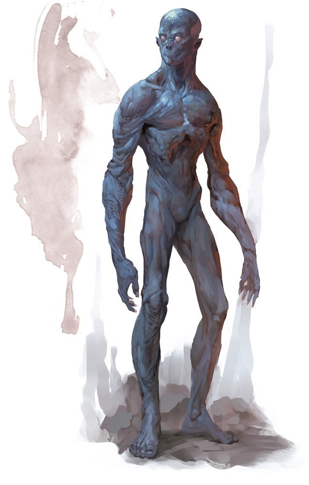 Плоть эльфа поплыла, как расплавленный воск, и прямо на моих глазах он вырос до двух с половиной метров. Длинные костистые руки отвисли до колен. Красочный лиловый камзол втянулся внутрь, становясь частью его тела. Исчезли волосы. Увеличились в размерах молочные глаза, лишившись зрачков и радужки. Кожа сменила окрас на цвет на стыке синего и серого. Полностью обнажённое существо, лишённое первичных половых признаков, застыло подле трона, с удовольствием взирая на нас.