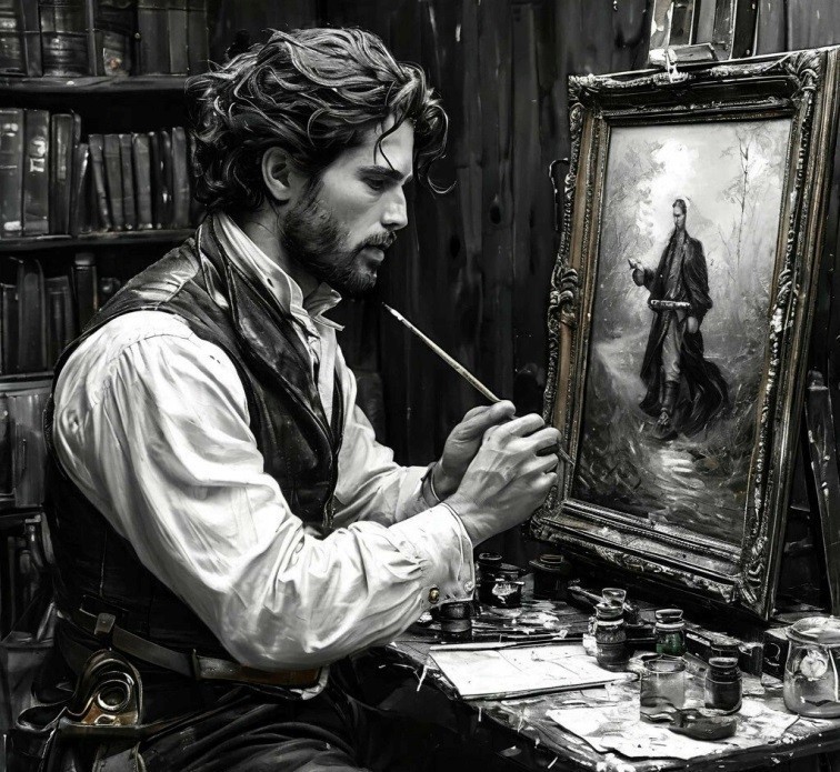 Робот помнил, как этот талантливый человек рисовал эти картины. Кисточка плавно скользила по холсту, прорисовывая самые мелкие детали исторических или эпических полотен. Изображение проявлялось как бы ниоткуда, словно от заклинания, произнесённого одновременно с действием волшебной палочки, которая была обычной кисточкой.